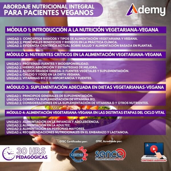 Curso asincrónico de abordaje nutricional integral para pacientes veganos que ofrece conocimientos esenciales sobre alimentación basada en plantas, nutrientes críticos, suplementación y recomendaciones para todas las etapas del ciclo vital