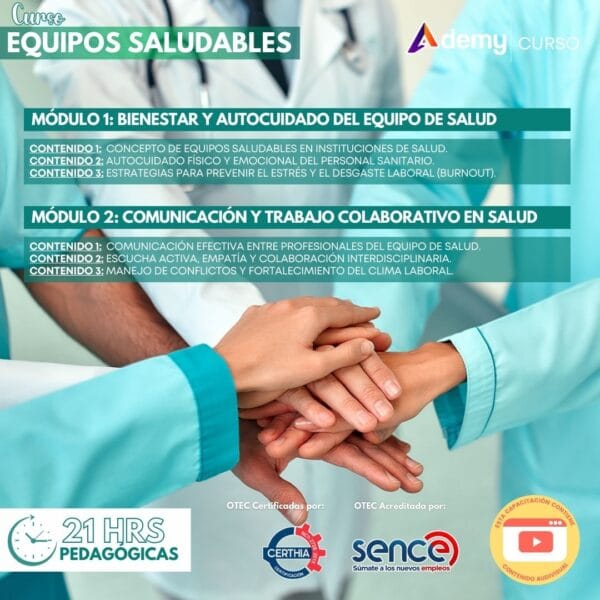 El curso Equipos saludables es una capacitación online asincrónica de 21 horas pedagógicas orientada a fortalecer el bienestar y la dinámica de trabajo en instituciones de salud. Está dirigido a profesionales y técnicos que integran equipos clínicos y administrativos, y que buscan mejorar el clima laboral y la colaboración interdisciplinaria.