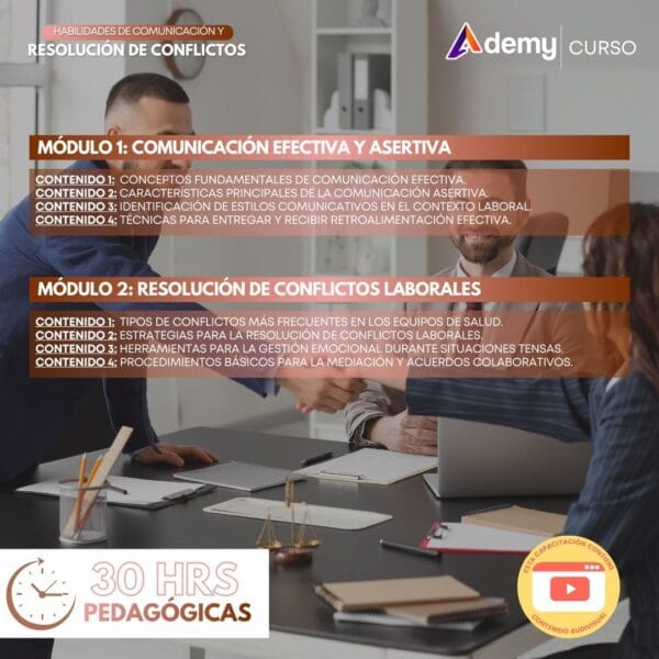 El curso Habilidades de comunicación y resolución de conflictos tiene una duración de 30 horas pedagógicas y se desarrolla en modalidad 100% online asincrónica. Incluye contenido audiovisual, material complementario y actividades prácticas orientadas al fortalecimiento de competencias interpersonales en el contexto laboral, especialmente en equipos de salud.