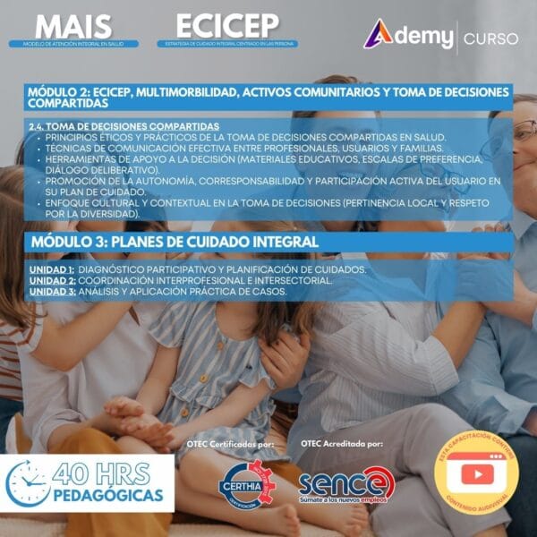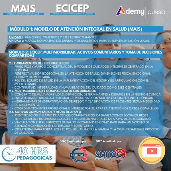 El curso MAIS ECICEP entrega herramientas prácticas para implementar el Modelo de Atención Integral en Salud y el Enfoque de Cuidados Integrales Centrado en la Persona, abordando multimorbilidad, activos comunitarios, toma de decisiones compartidas y planes de cuidado integral. Modalidad asincrónica con contenido audiovisual, 40 horas pedagógicas.